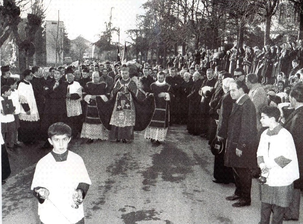 Parroco di Fresonara dal 1929 al 1965. Nella fotografia i funerali alla sua morte. In primo piano, vestito da chierichetto, nelle mie funzioni di turiferario, apro la strada al corteo